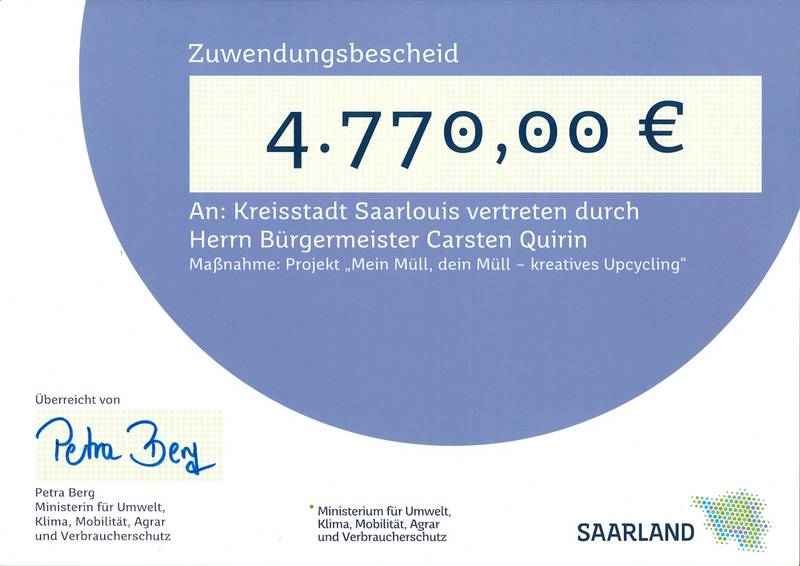 Für das Projekt „Mein Müll – dein Müll!? – kreatives Upcycling“ erhält die faire und nachhaltige Europastadt Saarlouis eine Zuwendung des Landes.