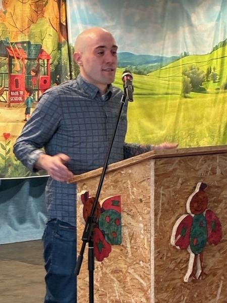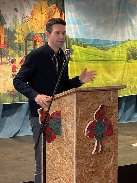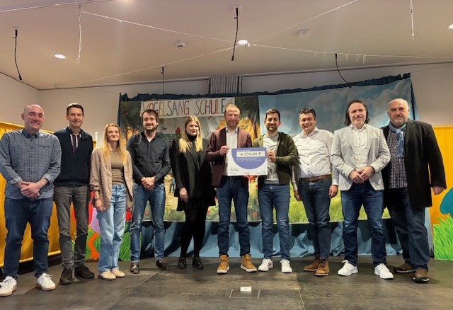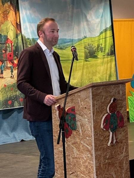 In Vertretung von Ministerin Petra Berg (Ministerium für Umwelt, Klima, Mobilität, Agrar und Verbraucherschutz) überreichte Patrick Ginsbach, Leiter der Stabsstelle Nachhaltigkeit im Ministerium, einen Check für die Zuwendung in Höhe von 4.770 Euro für das Projekt an Bürgermeister Carsten Quirin. Bürgermeister Carsten Quirin dankte dem Vertreter des Ministeriums für die Förderung und wünschte den Kindern viel Erfolg sowie Freude bei der Umsetzung der Projekte und der Auseinandersetzung mit der Thematik.