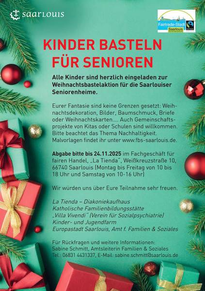 Das Bündnis „Faire Stadt Saarlouis“ veranstaltet mit fünf Bündnis-Partnern erneut die beliebte Weihnachts-Bastel-Aktion zugunsten der Senioreneinrichtungen in Saarlouis.